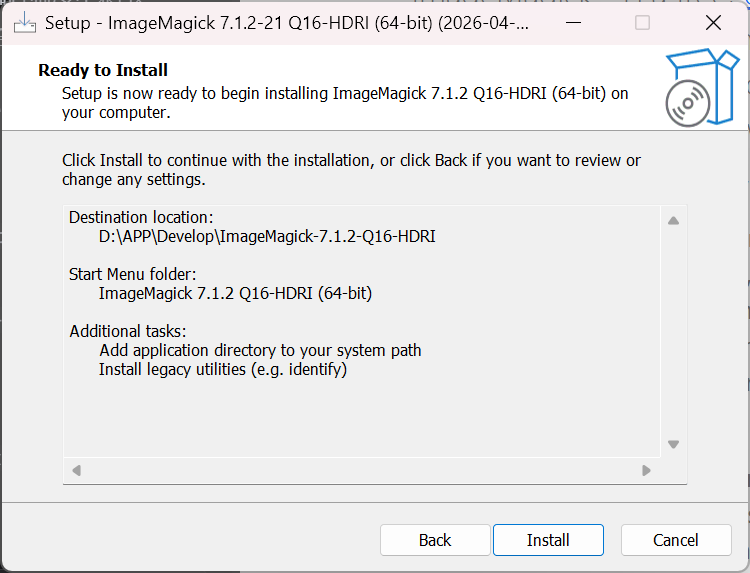 Install legacy utilities (e.g. identify)建议勾上。这样一些旧命令兼容性更好,很多示例里会用到 identify 之类工具,省得以后碰到命令不兼容。 -