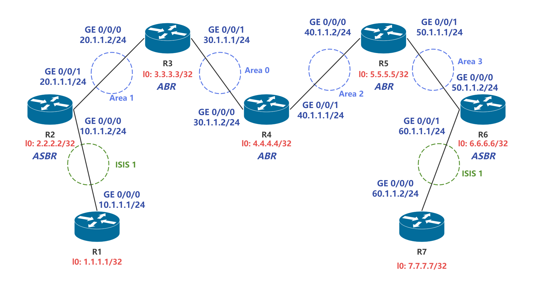 R2通过ABR下发的缺省路由与其他路由器(如R7)进行通信,而其他路由器(如R7)与R2之间的通信则采用明细路由方式。