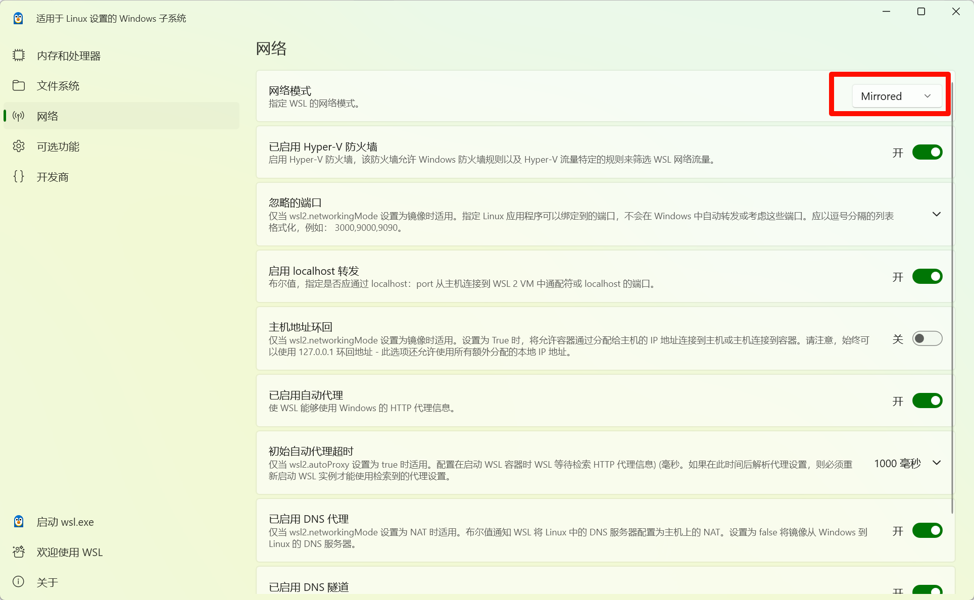 NAT模式下的IP每次启动可能会改变,故选用Mirrored模式固定IP