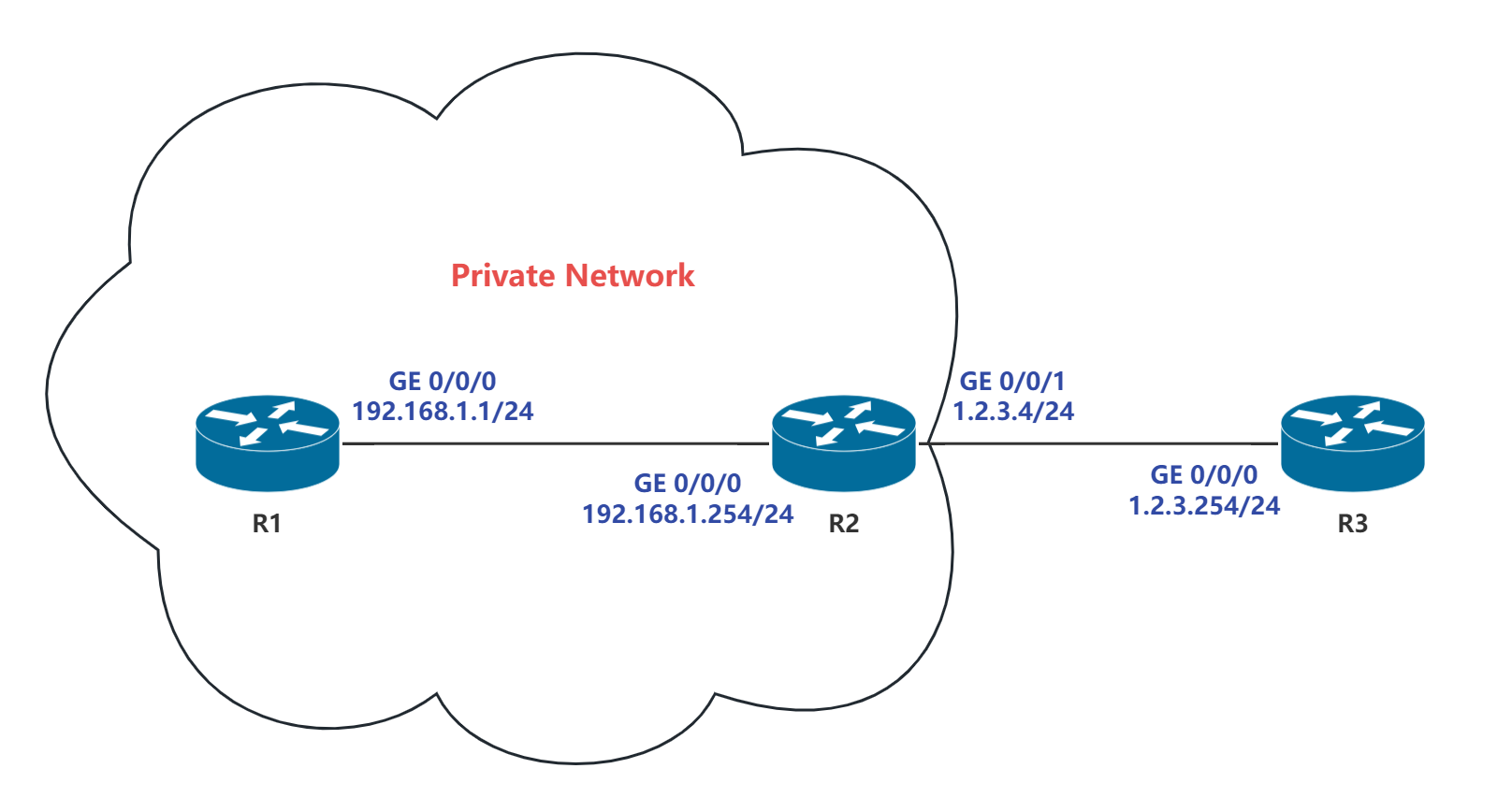 假设 R3 要向公网提供网络服务(用 telnet 模拟),由于 R3 没有公网 IP 地址,故需要在 R2 的出接口上配置 NAT Server