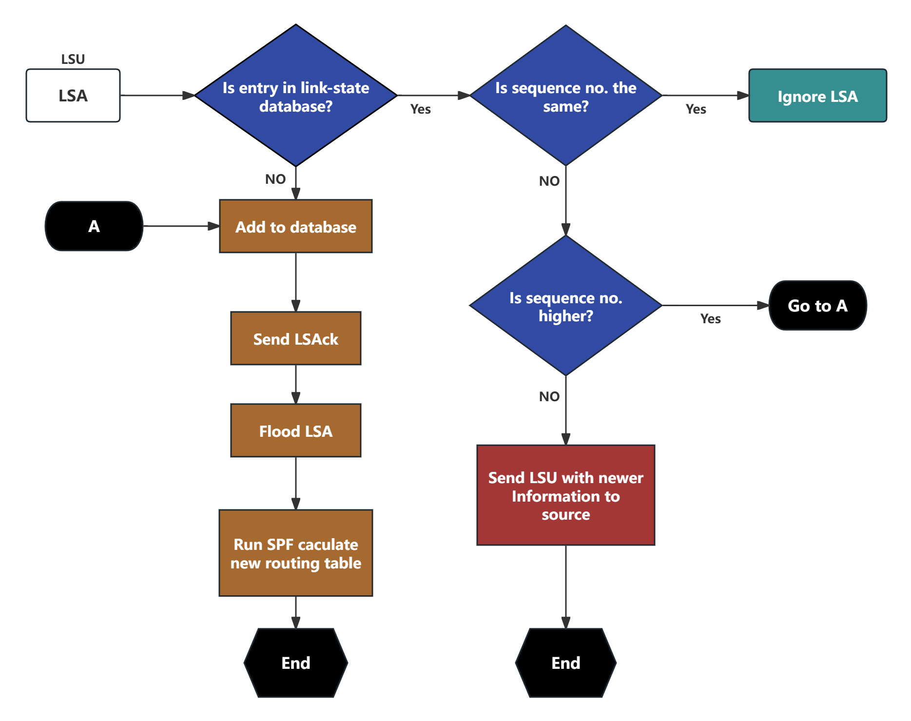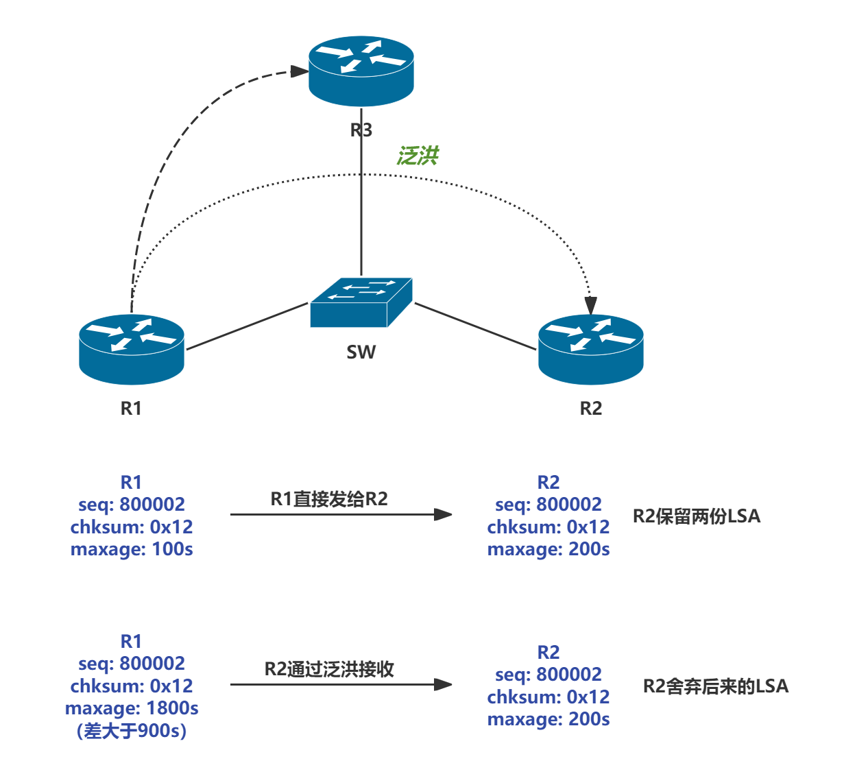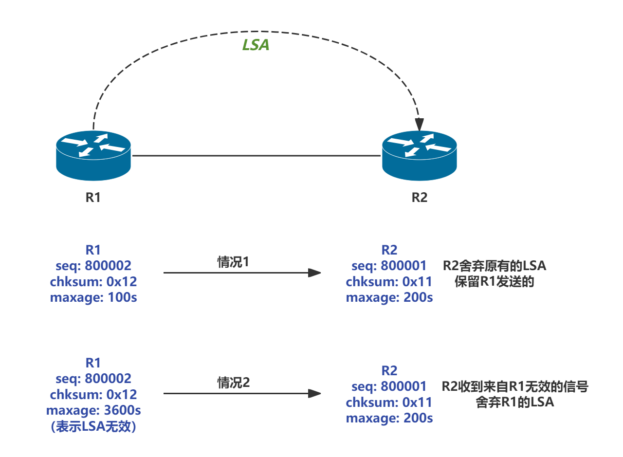 对于收到的LSA需要进行判断新旧,新的可以接收,旧的则丢弃,同时回复一份最新的给对方
