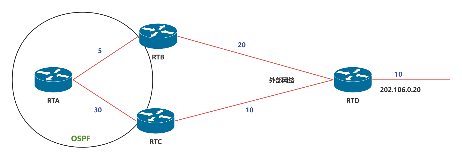 RTA有两条到达外部目的网络202.106.0.20的路径