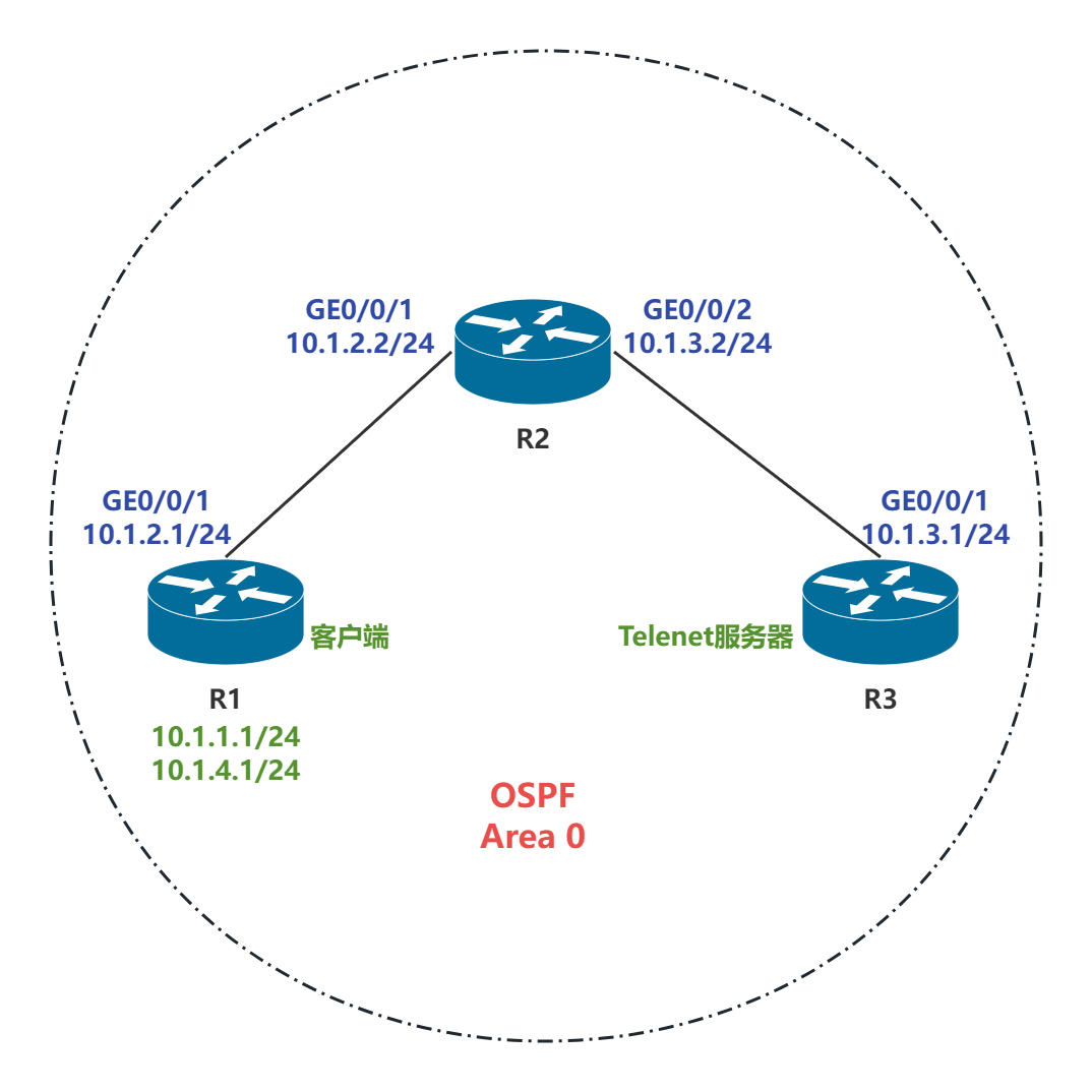 如组网图所示,R3 作为服务器,R1 作为客户端,客户端与服务器之间的路由是可达的。R1 与 R2 之间的互联物理接口地址分别为 10.1.2.1/24 和 10.1.2.2/24,R2 与 R3 之间的互联物理接口地址分别为 10.1.3.2/24 和 10.1.3.1/24。此外,R1 上创建了两个逻辑接口 LoopBack 0 和 LoopBack 1,分别模拟两个客户端用户,地址为 10.1.1.1/24 和 10.1.4.1/24。其中,R1 的 LoopBack 1 接口对应的用户需要远程管理设备 R3,可在服务器端配置 Telnet 服务,用户通过密码登录,并结合基于 ACL 的安全策略,确保只有符合安全策略的用户能够访问设备。