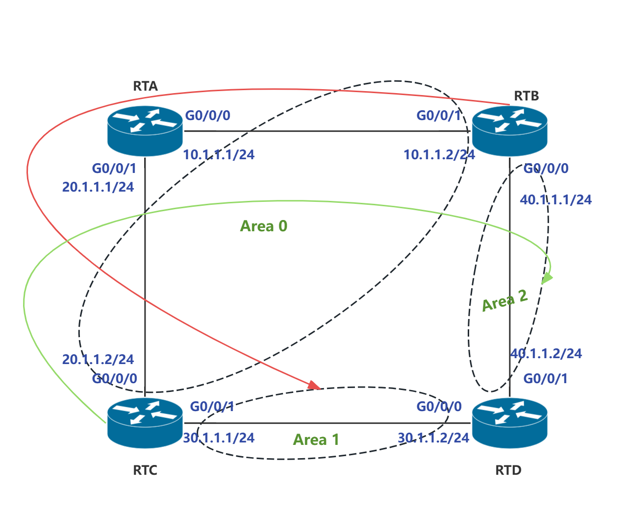 但因为ABR只能从骨干区域学习3类路由,因此RTC依旧无法通过RTD学习40.1.1.0/24,致使RTC到达40.1.1.0/24仍然选择使用次优路径