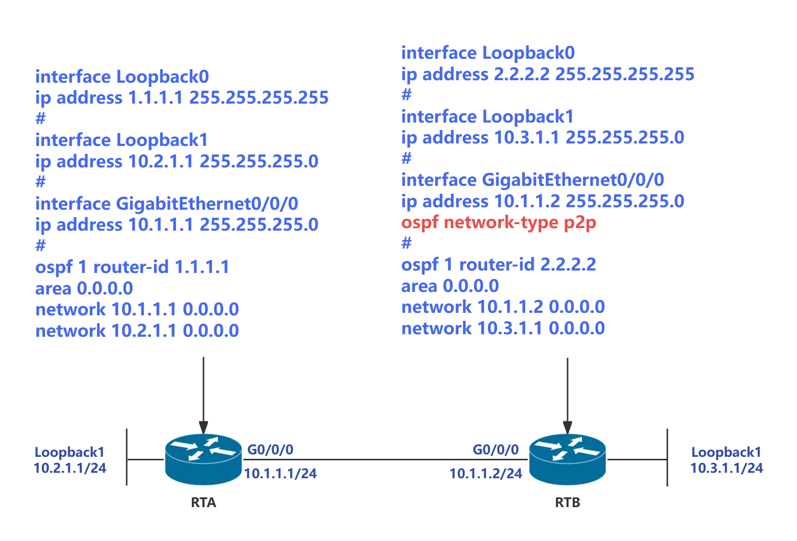 将RTA的G0/0/0接口的OSPF网络类型调整为P2P,与RTB保持一致,路由学习正常