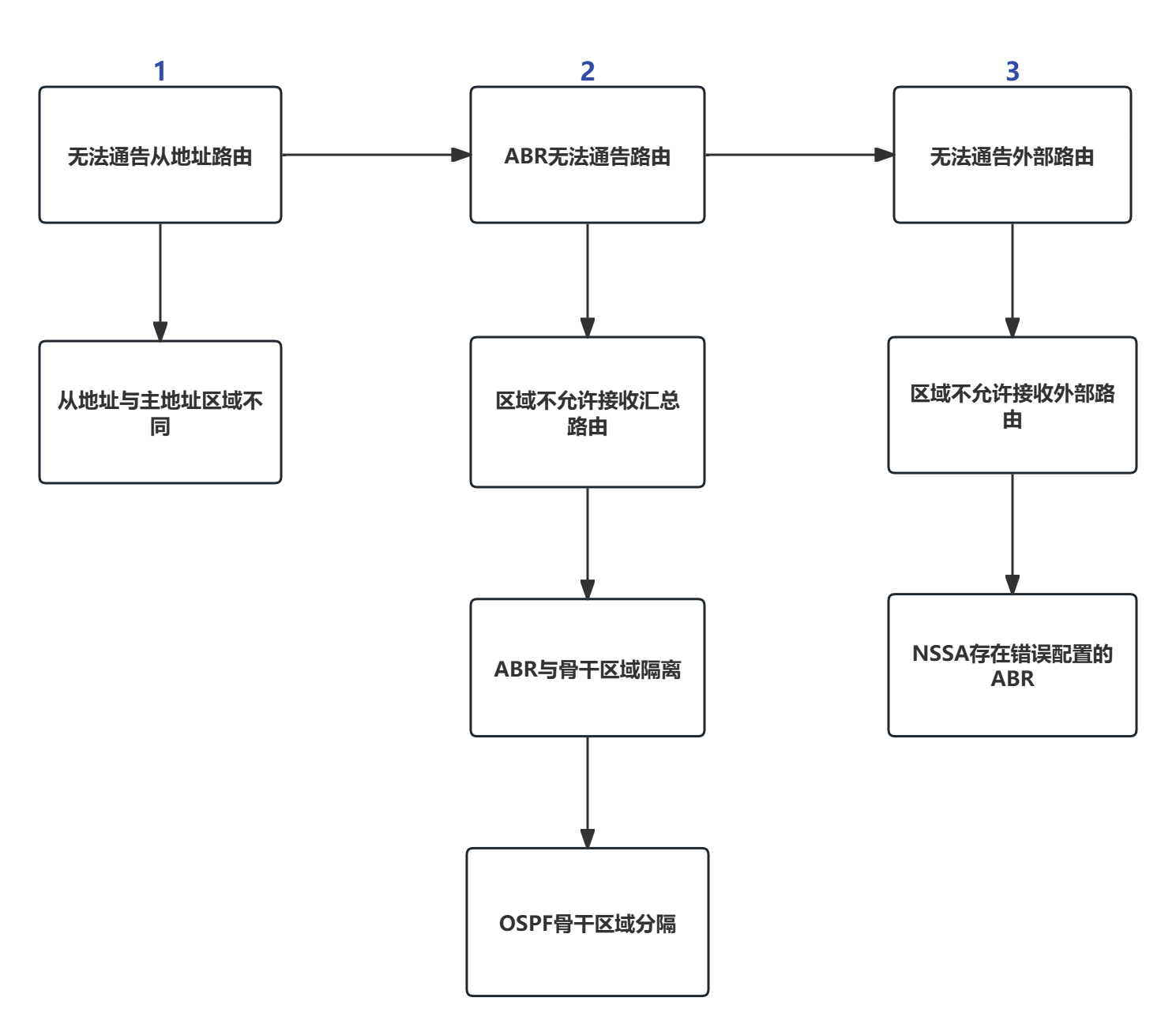 故障原因是RTD没有连接到Area 0,不是ABR,无法在区域间传递路由
