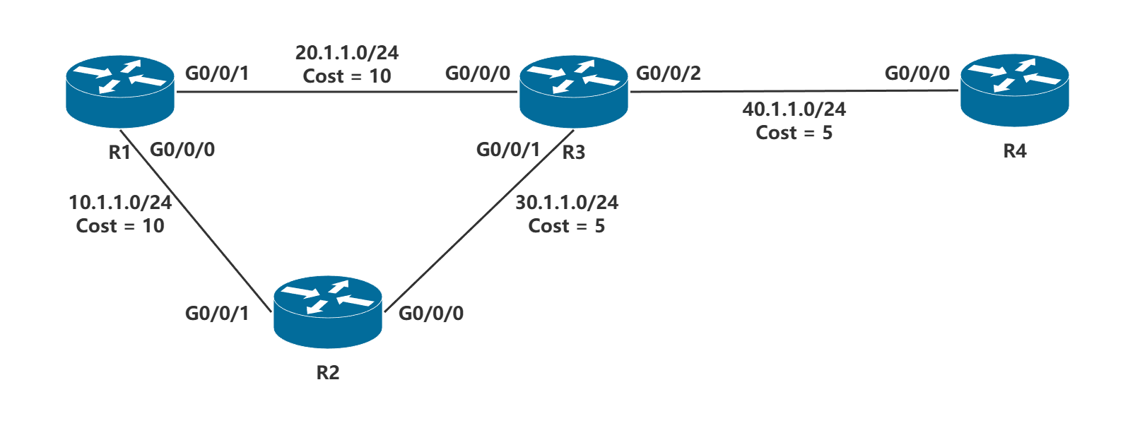注:若希望在主链路故障后,设备R1将流量切换至备份链路R2后继续向下游转发,则需要令网络开销值满足链路保护公式:Distance_opt(R2,R4)<Distance_opt(R2,R1)+ Distance_opt(R1,R4)