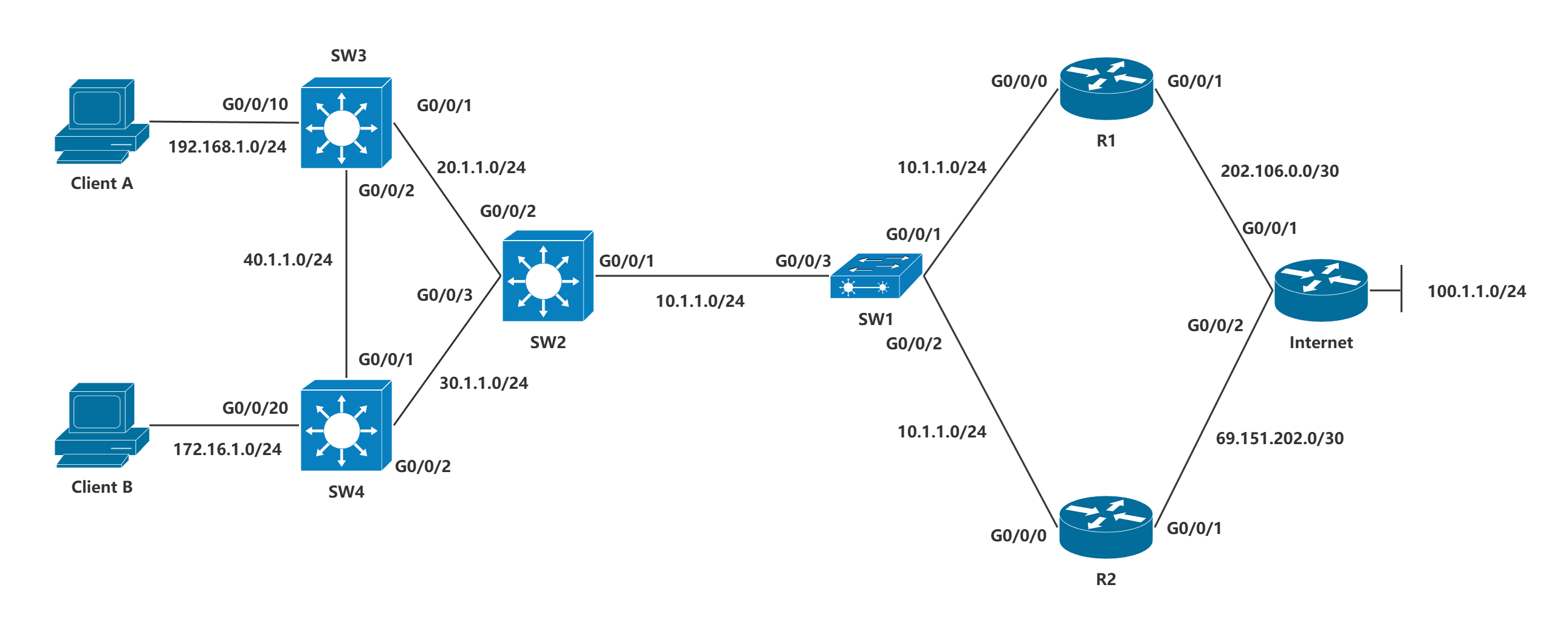 R1与R2作为企业边界出口设备,构成双出口冗余以实现负载分担。企业内部部署并运行OSPF路由协议,使Client A与Client B能正常访问 Internet路由器的100.1.1.0网络。为减少路由表容量,在 R1与 R2上配置缺省路由,从而在提供连通性的同时保证网络的高可用性。