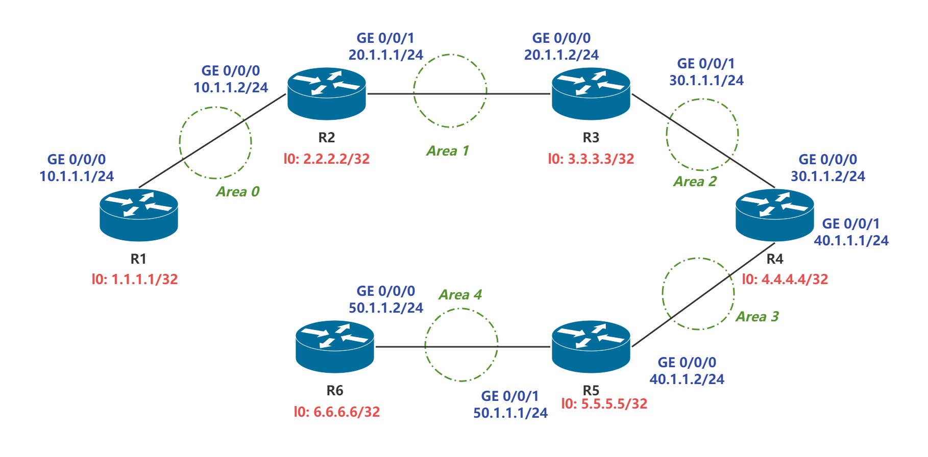 所有的路由器均能通过OSPF学习到全拓扑的明细路由。