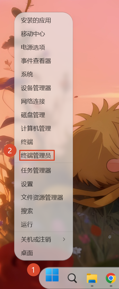 右键开始图标,点击:终端管理员